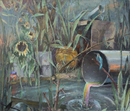 You think you know them, these places, these compositions of old things, of rubbish, of idyllic vegetation. You don't discover them by strolling, rarely by walking. To get here, you have to roam around, follow an urban explorer's instinct, leave paths, look for hiding places. Children and young people are best at this, but so are homeless people or graffiti sprayers. And then they appear, the traces of the heavy objects, the technical legacies from past decades. Like a whispering bag from the 1920s, musical instruments, fire extinguishers, drawers full of stuff vendor's tray from the cinema or a Converse Chuck shoe. Ambitiously piled high, romantically dropped down or burning warmth in a fireplace. Together they act like fertilizer, through them weeds blossom paradisiacally. After a few moments of contemplation, it finally becomes clear that Fritz Bornstück's pictures do not show real places, they only seem that way at first glance. They are un-places, exposed in hidden places and relocated in a fictitious map of the world. Larissa Kikol