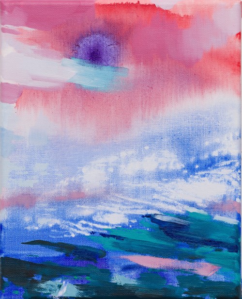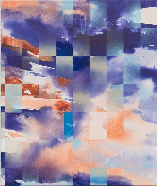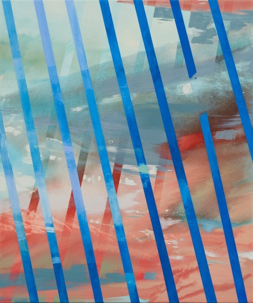 Michelle Jezierski’s work, infused with restless and spirited energy and free from established conventions and outdated formalisms, conjures whirling scenarios of juxtaposing images where light reverberates through vivid, gripping colors. Informing her work is a sensorial idea of fragmented space — simultaneously synchronic and deferred — with the landscape as a catalyst where the limitations of two-dimensionality are explored through the introduction of geometric lines and fixed frames that disrupt the picture plane. This idea creates an optical illusion that seemingly encompasses multiple dimensions within one flat surface.