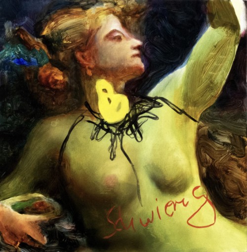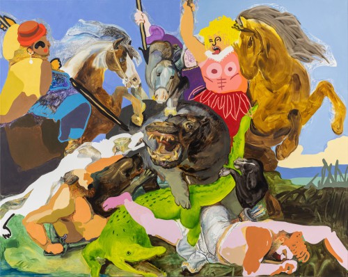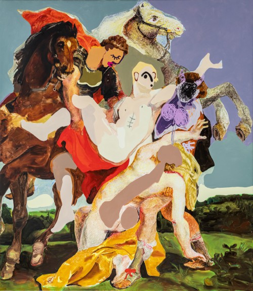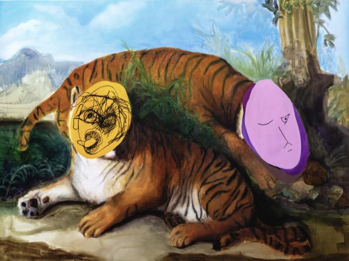 He explores a variety of themes in his paintings, from collage-like composition, with re- contextualising fragments, that result in unusual harmonies, which capture the viewer into Maas’s multiverses, where precision meets fluidity, to sepia-toned monkey portraits and self- portraits in which he explores the topic of gender in a series of works where his face is transposed into various female figures.