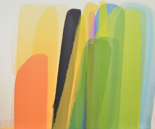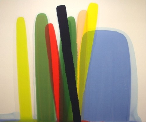To lean and to prop are the two behaviour patterns that Dawes allows, indeed welcomes to the canvas in his working process. His painting process is usually a lengthy one, which involves a gradual distillation of everything that makes a scene memorable: mood and atmosphere, feeling and emotions, bodily sensation and state of mind. In Dawes’s case, succession is signified physically by various means: by then overlay of one colour on another, by the orchestration and direction of the poured lines and shapes, by the implied sequential movements of the painter’s hand.