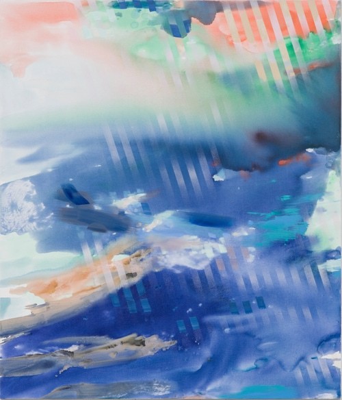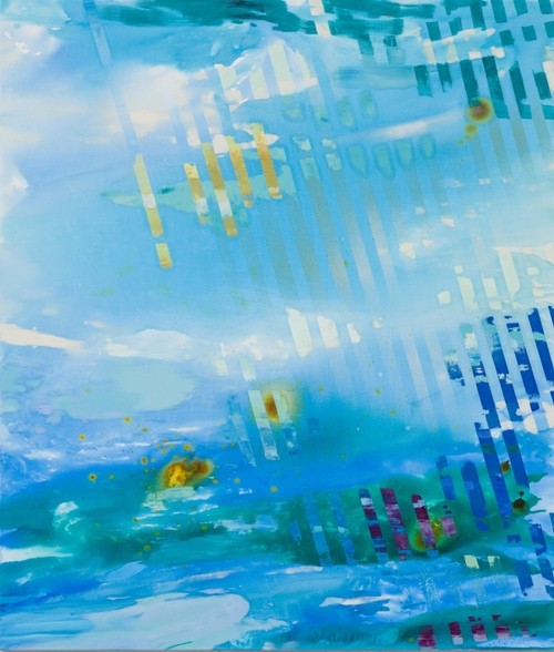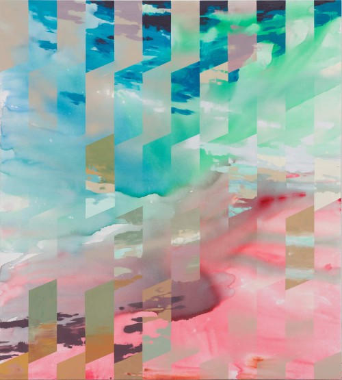 Michelle Jezierski’s work, infused with restless and spirited energy and free from established conventions and outdated formalisms, conjures whirling scenarios of juxtaposing images where light reverberates through vivid, gripping colors. Informing her work is a sensorial idea of fragmented space — simultaneously synchronic and deferred — with the landscape as a catalyst where the limitations of two-dimensionality are explored through the introduction of geometric lines and fixed frames that disrupt the picture plane. This idea creates an optical illusion that seemingly encompasses multiple dimensions within one flat surface.